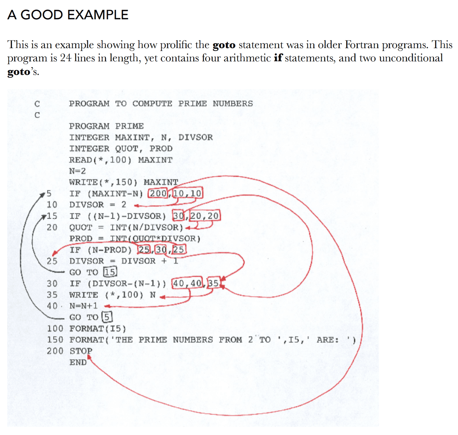 Here is a typical example of legacy goto in a simple FORTAN function for computing prime numbers. Note the line numbers on the left - a goto could go to any line number in the program.